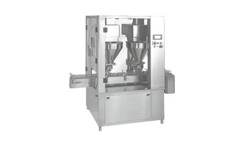 The Automatic Twin Head Linear Augur type Dry Syrup Powder Filling Machine Model DRYFILL-60TWIN, Linear Auger Powder Filling Machine, and Suspension Bottle Filling Machine is suitable for Filling Dry Syrup Powder in various type and shape of bottles with maximum speed of 60 Bottles per minute depending on Fill Volume, type of Powder and Bottle Size using Single track twin hopper system. Machine with proven Augur type Powder Filling System for filling higher volume of Powder in Single Dose. All Parts coming in contact with powder are made from S.S. 316, Nylon and HDPE material. Machine with No Change parts system for change in Size of Bottles due to pneumatically operated bottle separator system as well as PLC Controlled SERVO Augur Filling System for Fill Volume. Machine with Optional Turn Table for Round Bottle at the infeed and Outfeed for continues feeding of bottles as well as collection.